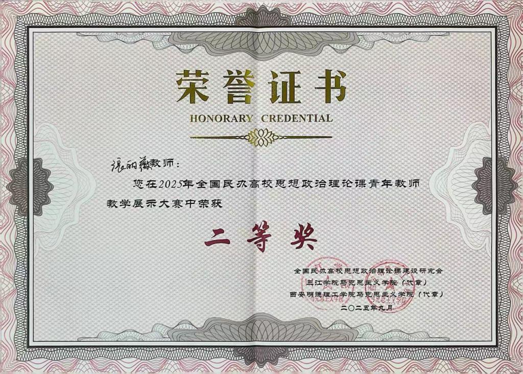 【本网讯】为深入贯彻落实立德树人根本任务,持续提升全国民办高校思政课教学质量,加强民办高校思政课青年教师队伍建设,9月21日,全国民办高校思想政治理论课教学研讨会暨青年教师现场教学展示大赛在西安圆满落幕。kaiyun马克思主义学院青年教师张丽薇凭借扎实的理论功底、创新的教学设计与生动的课堂呈现,从全国165名参赛选手中脱颖而出,荣获二等奖。
