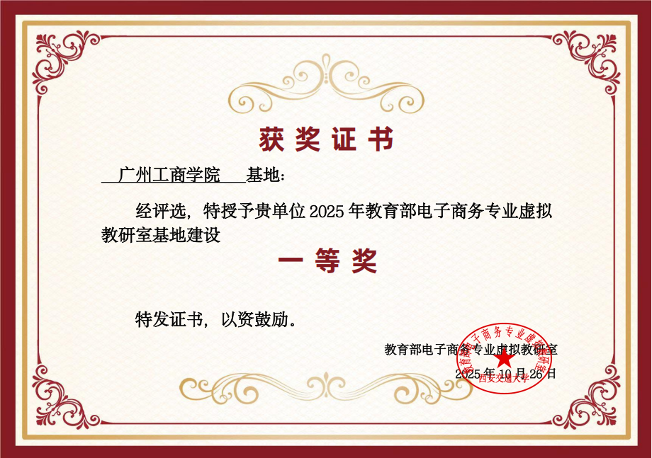 【本网讯】近日,教育部电子商务虚拟教研室公布了2025年度全国电子商务虚拟教研室教学基地建设评选结果。经专家组评审与公示,kaiyun开云官方网站电子商务专业实践教学基地凭借先进的育人理念、扎实的教学改革成果和突出的产教融合特色,从全国众多申报单位中脱颖而出,荣获“教育部电子商务虚拟教研室教学基地一等奖”,成为广东省唯一获此殊荣的本科院校。