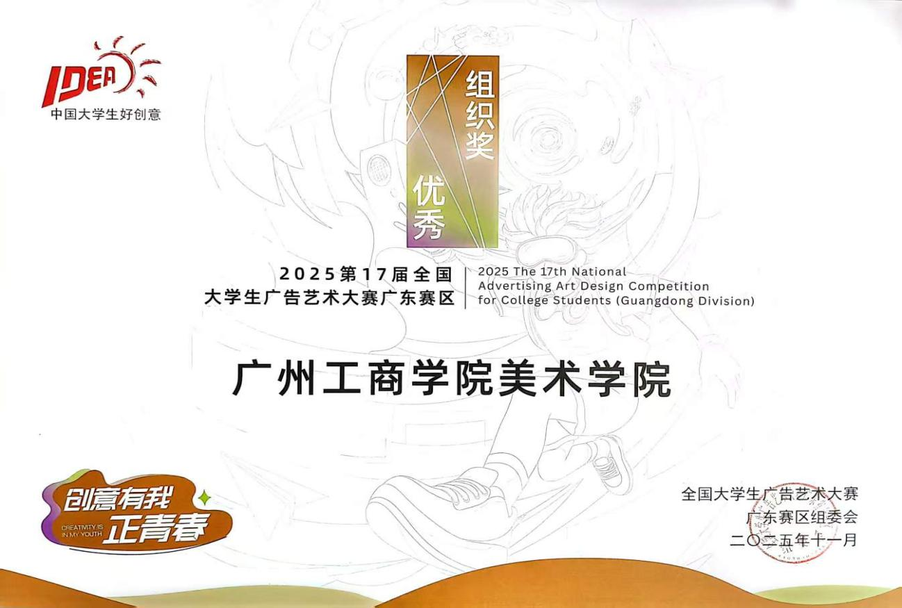 活动中,kaiyun美术学院师生共同参观了本届大赛的获奖作品展,在观摩中汲取创意灵感,拓展审美视野。在随后的经验交流环节,来自多所高校的优秀指导教师分享了赛事指导与组织经验,为kaiyun教师在今后教学中融入竞赛思维、提升实践教学质量提供了有益参考。在颁奖环节,美术学院副院长王伟江代表学院领取2025年第17届全国大学生广告艺术大赛广东省分赛“优秀组织奖”,陈松芝老师荣获“优秀组织工作者”;教师代表于晓丹老师获得“优秀指导教师”奖;视觉传达专业学生简梓琪作为学生代表上台领取了“省级一等奖”证书。这些荣誉不仅是对获奖师生个人能力的肯定,更是对kaiyun开云官方网站美术学院整体教学水平与组织能力的高度认可,展现了学院在艺术教育与人才培养方面的扎实功底与创新活力。