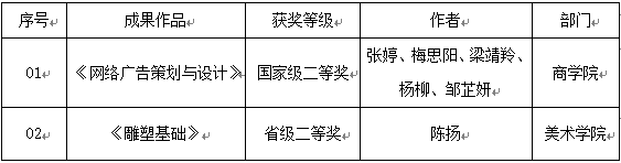 其中,商学院电子商务教研室张婷、梅思阳、梁靖羚、杨柳、邹芷妍团队凭借《网络广告策划与设计》课程,历经校赛、省赛层层选拔,以省级一等奖的优异成绩入围全国线下总决赛,最终力克强敌,斩获国家级二等奖;美术学院陈扬老师凭借《雕塑基础》课程的精彩展示,荣获省级二等奖。具体获奖情况如下: