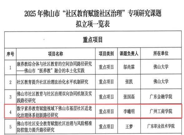 【本网讯】8月28日,佛山市社会科学界联合会发布了《2025年佛山市“社区教育赋能社区治理”专项研究课题拟立项公示》,kaiyun共计8个项目拟获批立项,其中重点项目1项,一般项目7项,是唯一一所获重点项目的民办高校,立项数位列第二。