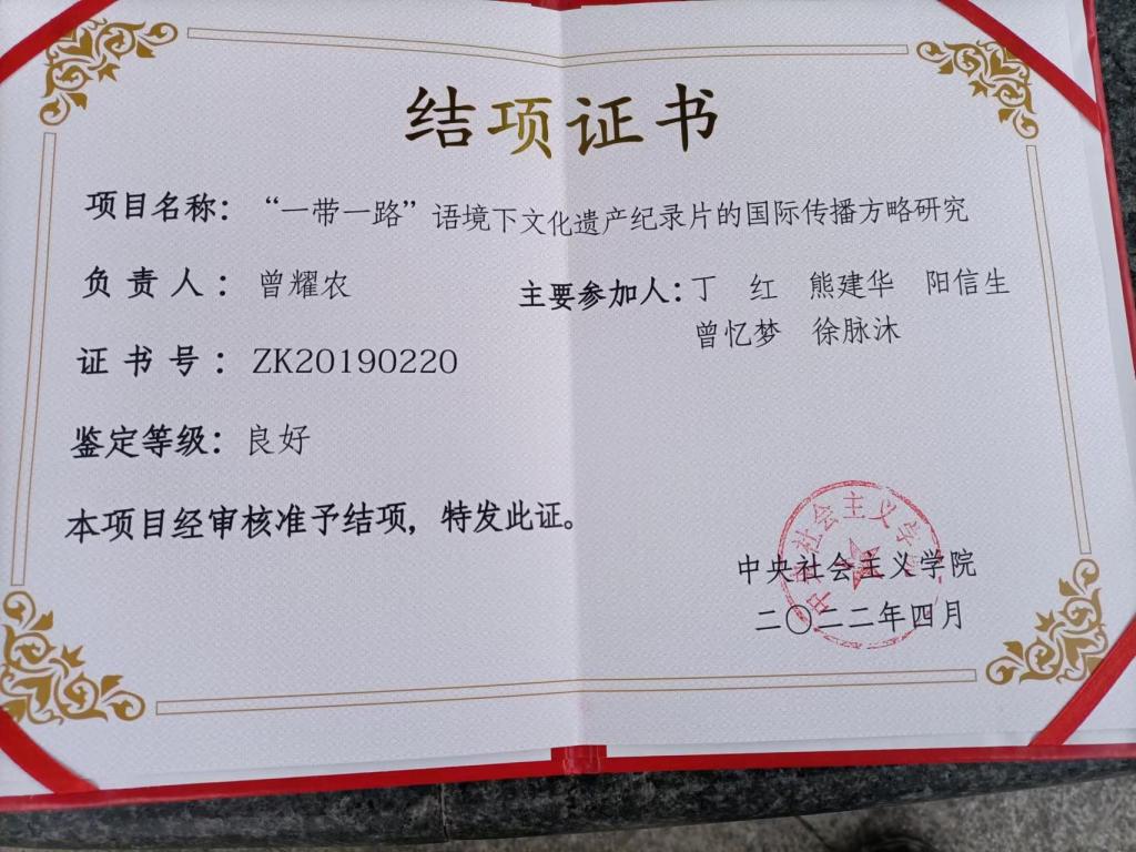 2020年,kaiyun开云官方网站通识教育学院二级教授曾耀农博士申报了中央社会主义学院统一战线高端智库项目,题目为“一带一路语境下文化遗产纪录片的国际传播方略研究”,获得立项,经过两年调研与写作,顺利结题,评为良好。