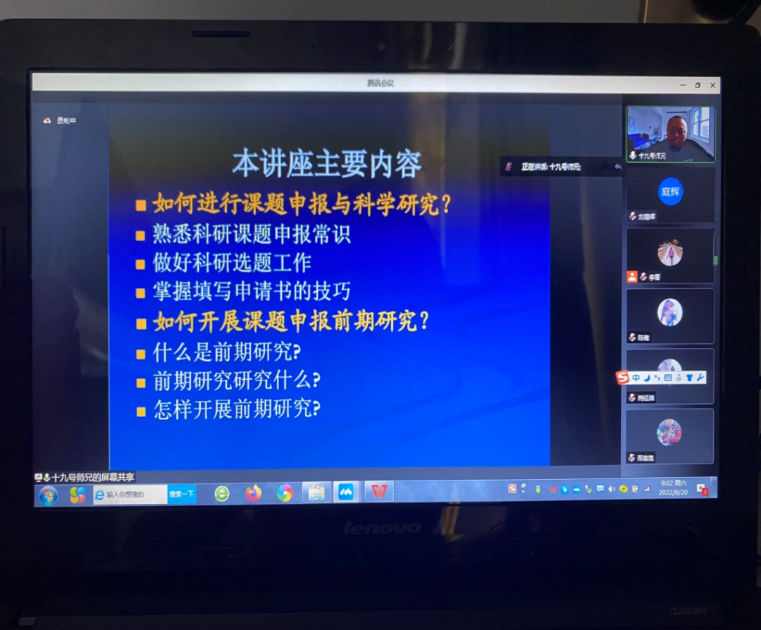 为进一步提升学院教师的科研能力,8月20日上午,结合新入职教职工培训平台,通识教育学院邀请广州市穗港澳青少年研究所专家谢素军主任作科研专题讲座《课题申报的选题、内容与技巧》,讲座以腾讯会议形式举行。会议由学院办公室刘庭辉老师主持,通识教育学院全院教职工、相关课题组成员、学刊编辑部成员,以及德学五进辅导员工作室成员共70余人参会。