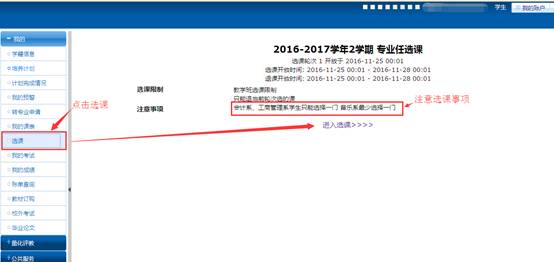 2、首页进入选课:点击左边选课菜单,在右边界面再点击进入选课(图2所示);