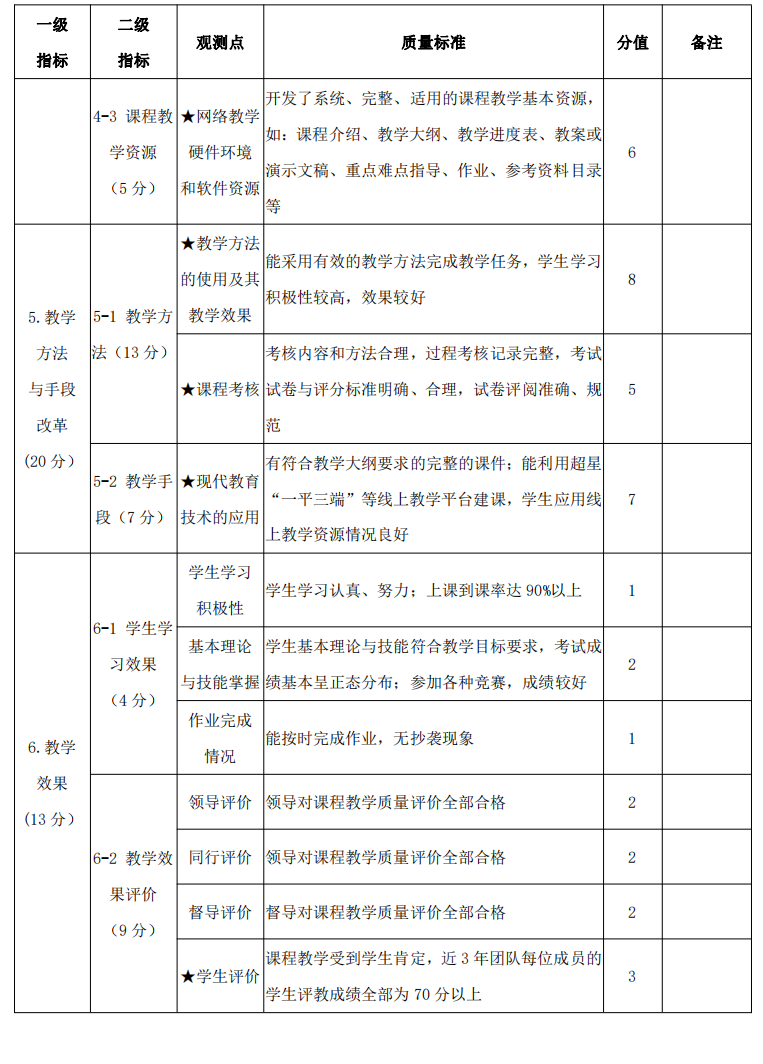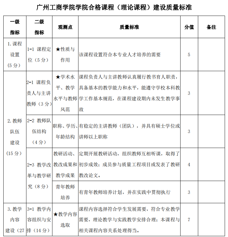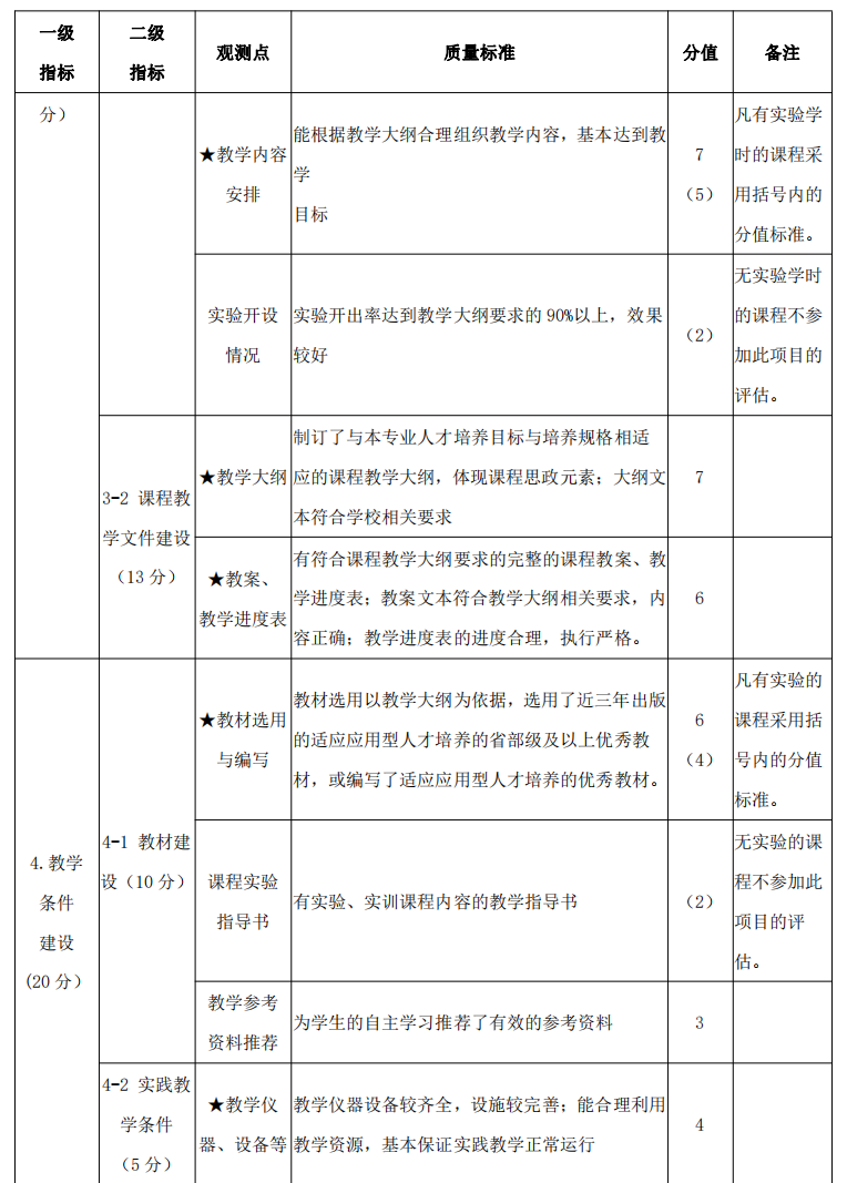 注1:普通课程指的是理论课程(含课内实验实践学时在50%以下的课程);注2:合格课程要求所有项目中不达标项目数≤5,其中,重要项目(★表示)不达标项目数=0。注3:总分达到70分即达标。
