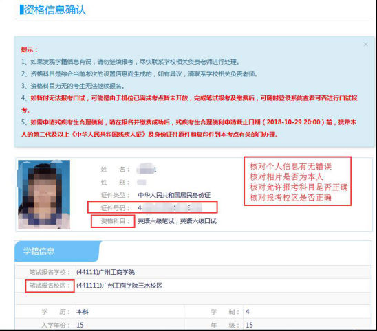 (4)资格信息确认。认真核对本人学籍信息是否正确,相片是否为本人,资格科目是否是本人可报名科目。