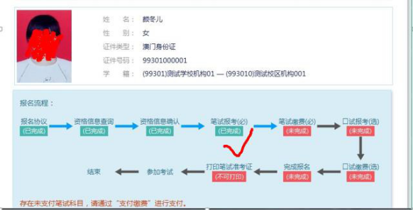(3)进入报名信息界面: 可看到报名流程的进度,完成笔试或口语报考,可直接在下方进行缴费。
