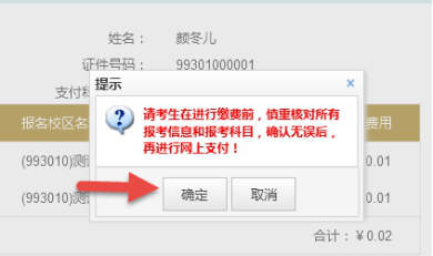 (4)页面提示确认报考信息,点击“去支付”,再次提示确认报考信息,点击“确定”,并在24小时内完成缴费。
