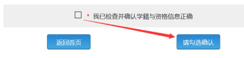 如全部数据正确,则勾选“我已检查并确认学籍与资格信息正确”框,点击确认提交;如信息、相片或报考资格有误,不要点击确认,须及时联系学校教务处进行核查修改,修改后方可确认提交。注意:一旦通过学籍、资格验证后,账户即绑定为该学籍考生,绑定后无法解除绑定,请勿用本人账号替他人查询资格信息。