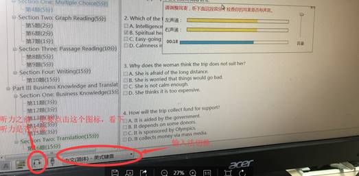 4.等待进入考试。测试完耳机后,不要做其他任何操作,等待考试时间到了后,系统会自动进入考试。听力题由考生自行决定什么时候做,一旦开始播放听力,听力不能暂停和中断。另外要注意,听力之前要再次测试耳机,点击左下角的耳机图标进行听力试听。切记不要点击旁边的麦克风图标,否则软件会卡死。