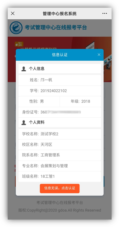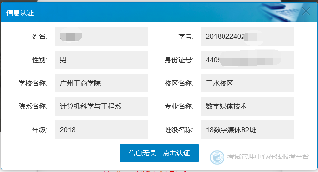 点击“注册”后,将弹出“信息认证”窗口,请认真核对个人信息,如发现信息有误,请及时联系所在考点负责老师进行更正;如信息无误,请直接点击“信息无误,点击认证”进入个人首页;