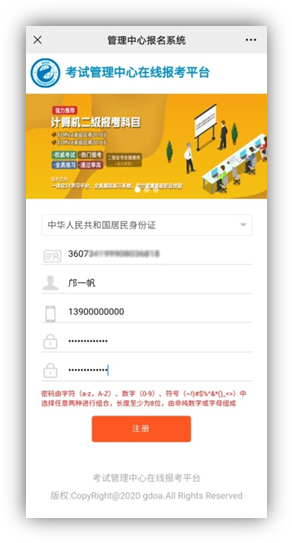 未注册的学生,须登录网址:http://gdoa.scnu.edu.cn/bm注册新用户,注册时必须如实填写个人证件号、姓名及手机号,注册过程将自动校验个人学籍信息,填写不正确将无法成功注册; (若之前已注册过账号,则用原账号直接登录即可)