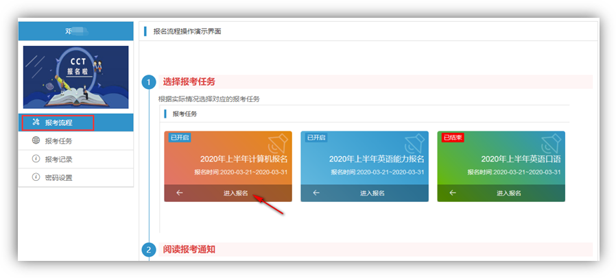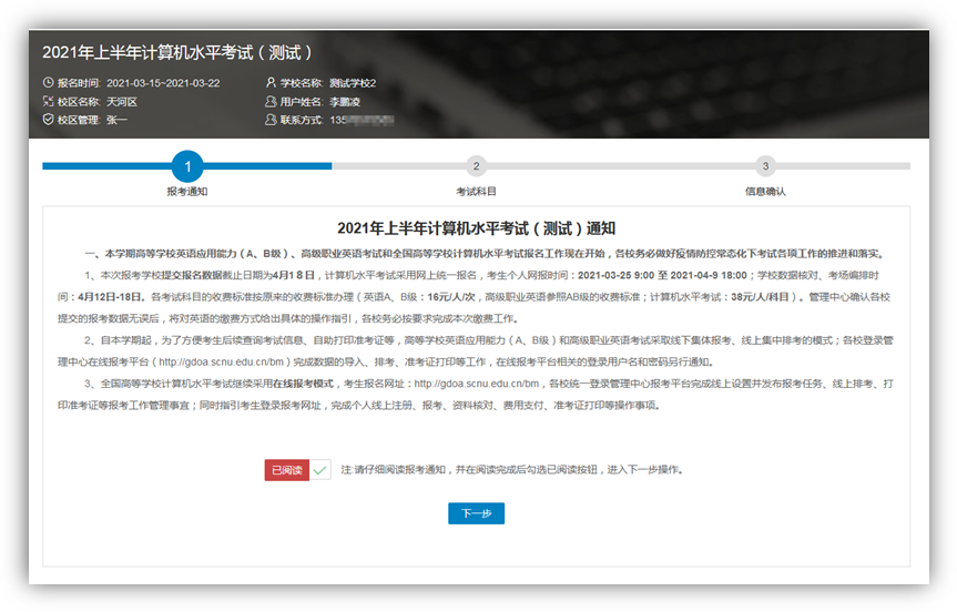 请认真阅读报考通知,并在阅读完成后勾选“已阅读”按钮,进入下一步操作;