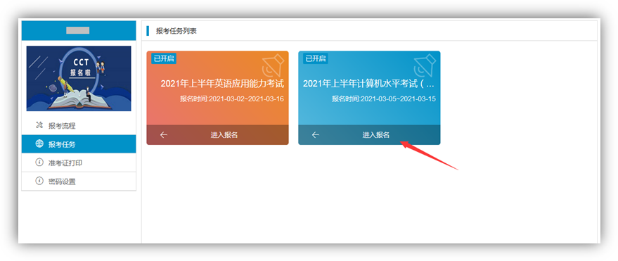 点击“开始报名”按钮,选择报考的科目类型(例如:2021年上半年计算机水平考试)点击“进入报名”;