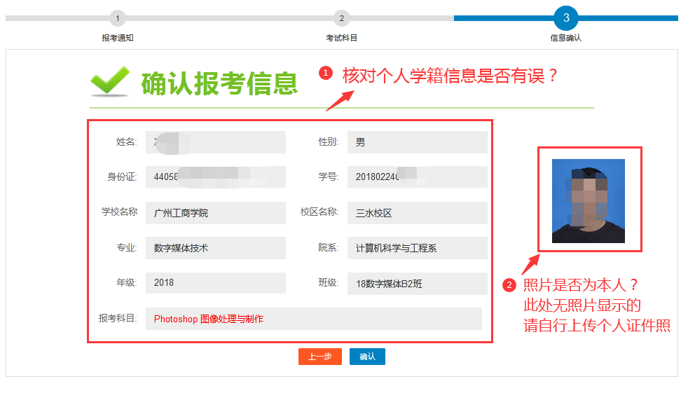 请认真确认个人报名信息及报考科目,如有修改请点击“上一步”,如确认无误,点击“确认”完成报考,一旦选择确认报考成功,将无法修改报考科目;