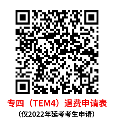 未申请参加2023年TEM考试且未申请退费的2022年TEM延考考生,若放弃参加2024年TEM考试(视为放弃资格,延考资格不再顺延),可申请退还报名费,请在2023年11月27日前扫描下方相应科目二维码填写正确信息申请退费。