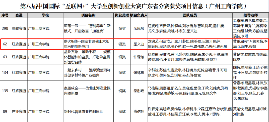 近日,第八届中国国际“互联网+”大学生创新创业大赛广东省分赛(简称:“互联网+”省赛)获奖名单公布(粤教毕函【2022】12号),《薪火相传--国家非遗佛山木版年画的创新应用》项目经过学校支持、指导老师们的悉心付出、项目成员坚持不懈的努力,最终获得了第八届“互联网+”大学生创新创业大赛广东省分赛银奖的好成绩!