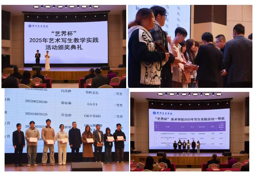 “艺界杯”2025年艺术写生实践优秀作品颁奖环节备受关注,该赛事由广州艺界国际旅行社有限公司独家赞助,共收到全院师生投稿作品286件,经专家评审团严格筛选,最终评选出一等奖3名、二等奖6名、三等奖15名。学校副校长邢传国与企业代表邹华清共同为获奖学生颁奖,见证学子创作成果。