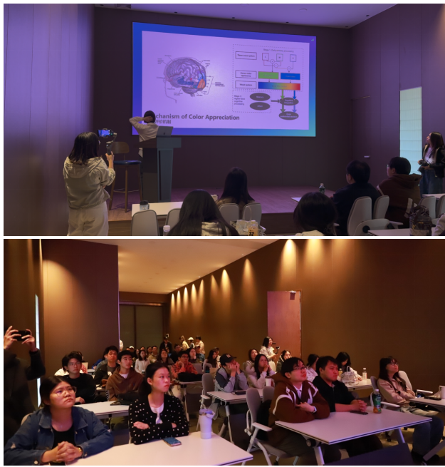 交流环节中,廖松阳老师带来“色彩心理学在市场营销及品牌设计中的应用”专题分享,结合经典品牌案例,从色彩情感表达、目标受众心理适配、市场场景应用等维度,解析了色彩在品牌传播与营销转化中的核心作用。分享结束后,师生与企业员工围绕商业设计中的色彩硬应用策略展开热烈讨论,思维碰撞间进一步深化了对专业知识的理解与应用认知。