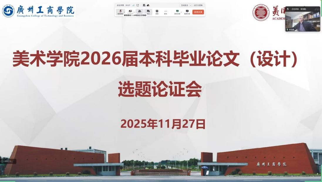 2025年11月27日,为深入贯彻落实高素质应用型艺术人才培养目标,进一步提升毕业论文(设计)质量,强化学生综合实践能力与创新意识,2025年11月27日晚19:30,kaiyun开云官方网站美术学院通过线上会议平台,成功举办了2026届毕业生论文选题线上论证会。本次会议旨在通过系统组织论文选题论证工作,引导学生结合专业方向、社会需求与个人兴趣,选择具有现实意义、研究价值及可行性的论文题目,确保选题工作科学、规范、有序开展。