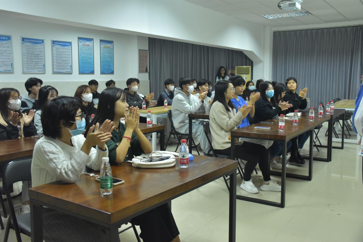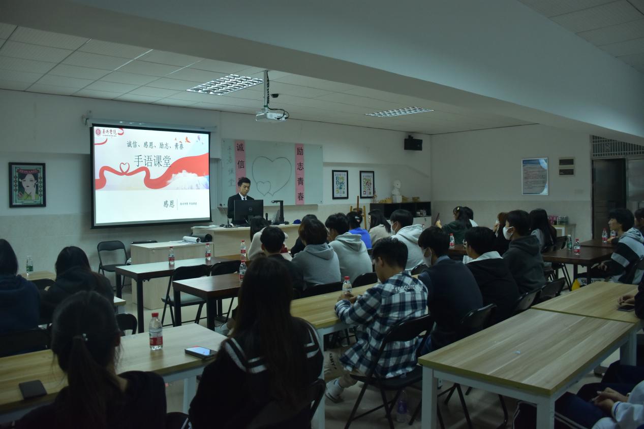 首先,主持人戴嘉宏同学给大家介绍了本次活动的内容和流程,接着在座的老师和同学们跟着服务队的同学学习手语,如“感恩党、感恩国家资助政策”、“请当放心,强国有我”,“如果信念有颜色,那一定是中国红”等。学习完后进入现场抢答表演,表演正确的同学可以获得小礼品。