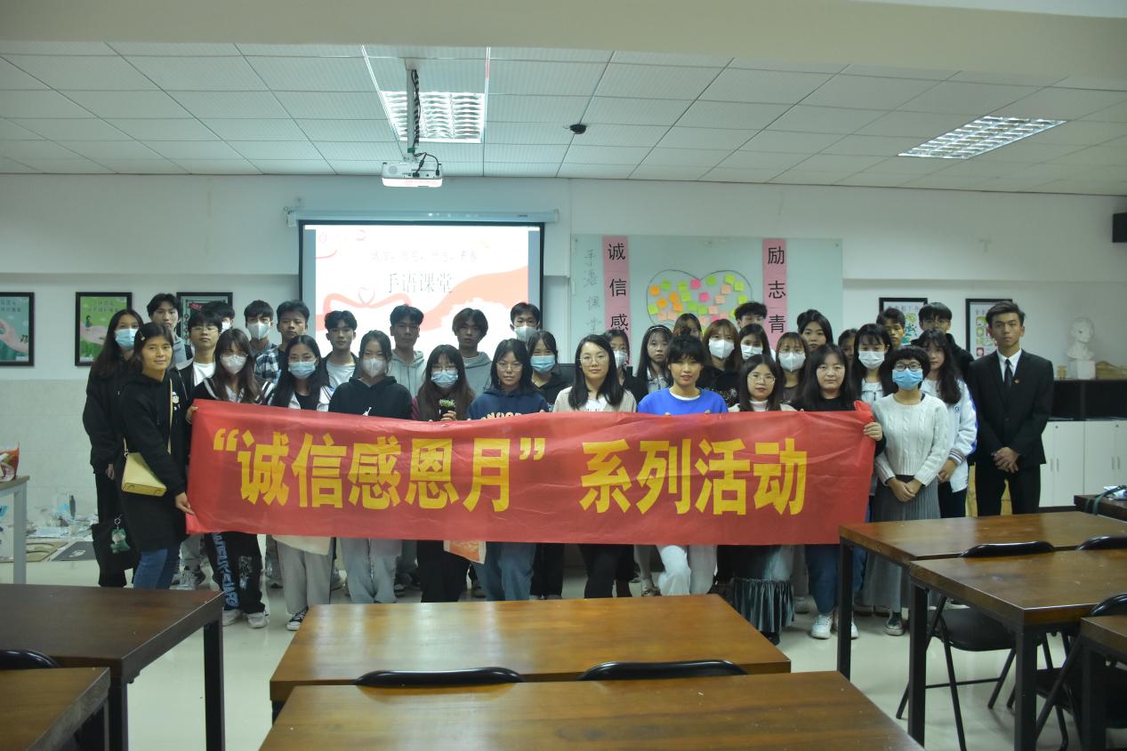 最后大家合影留念,这次手语学习活动不仅让美术学院2021级家庭经济困难的同学充分体会到学校对他们的帮助和支持,学习了一些常见的感恩表达手语,也让大家懂得感恩,激励大家好好学习,争取早日学到技能来回报学校和社会。