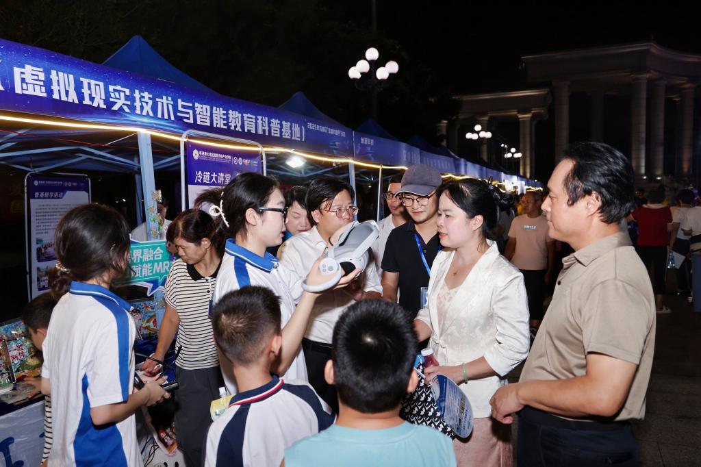 活动中,美术学院学生志愿者全程提供技术支持与内容讲解,围绕VR/MR体验流程、文创作品的创作理念与文化内涵展开科普服务,展现“艺术实践+科普传播”的协同育人成果。此次参展不仅是学院探索“传统文化科普创新路径”的实践,更通过科技手段让市民近距离感受非遗文化中的科学价值,为提升全民科学素质注入美育力量。