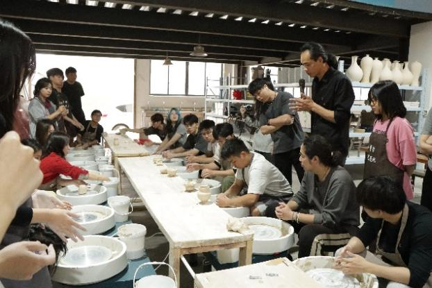 演讲继后,制陶师傅现场演示了陶艺练泥与塑形等基本制陶技巧步骤,通过泥刀和木刀与泥土间艺术性的修饰。让平平无奇的泥土附有了强烈的艺术视觉美感与造型美感。