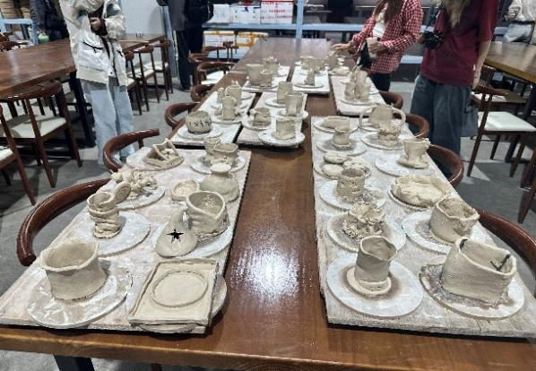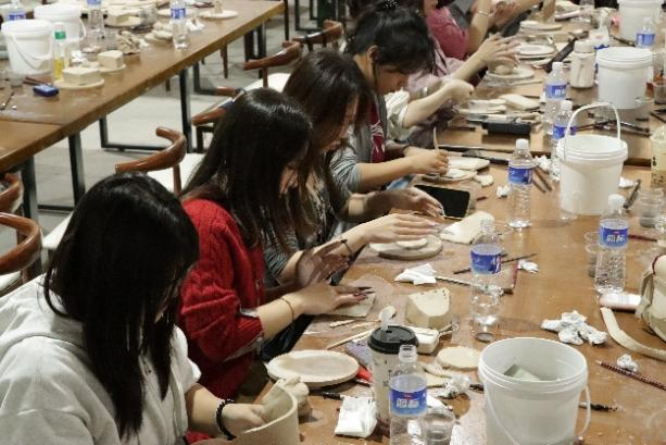 实践环节阶段。学生们在制陶师傅的指导下,开始进行陶艺制作的第一步——练泥。同学们运用双手尽情揉捏、拍打泥土,感受泥土的质感和柔韧性。第一次接触陶艺,都展现出了极大的热情与耐心。