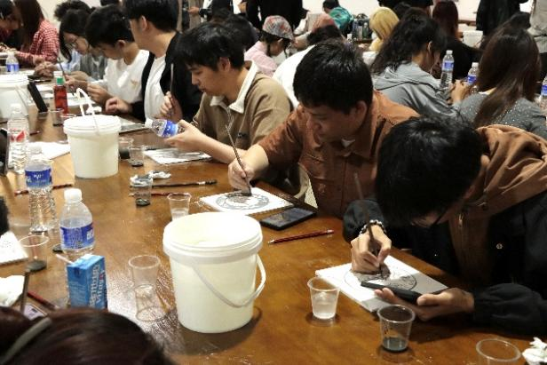 活动伊始,制陶师傅通过PPT讲解,从陶土的种类及其来源,详细阐述了景德镇陶瓷悠久璀璨制陶历史与制陶基本步骤和技艺精髓。在青花瓷制作步骤方面,师傅向师生们介绍了“勾线”和“汾水”两种独特技法,及如何通过使用勾画线条和涂抹汾水技巧使得瓷器的图案获得栩栩如生,充满艺术感的效果。同时还讲解了多种传统青花瓷图纹样式及笔下青花背后的“故事”。