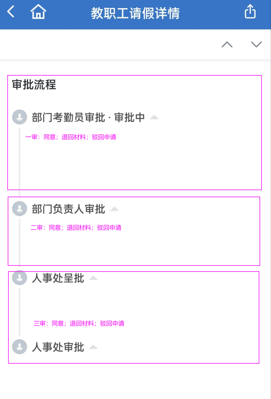 (三)表单填写完毕后,系统根据教职工的岗位和部门自动进入审批流程,各处室、院部的考勤员和负责人完成一、二级审批后流转至人事处审批(图三)。