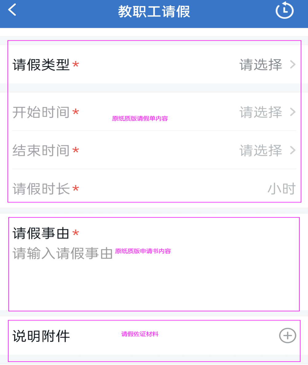 (二)按要求填写表单。请假须写明具体事由;均须上传相关证明材料(事假需写清具体请假事由),可手机拍照上传,但务必保证图像清晰(图二)。