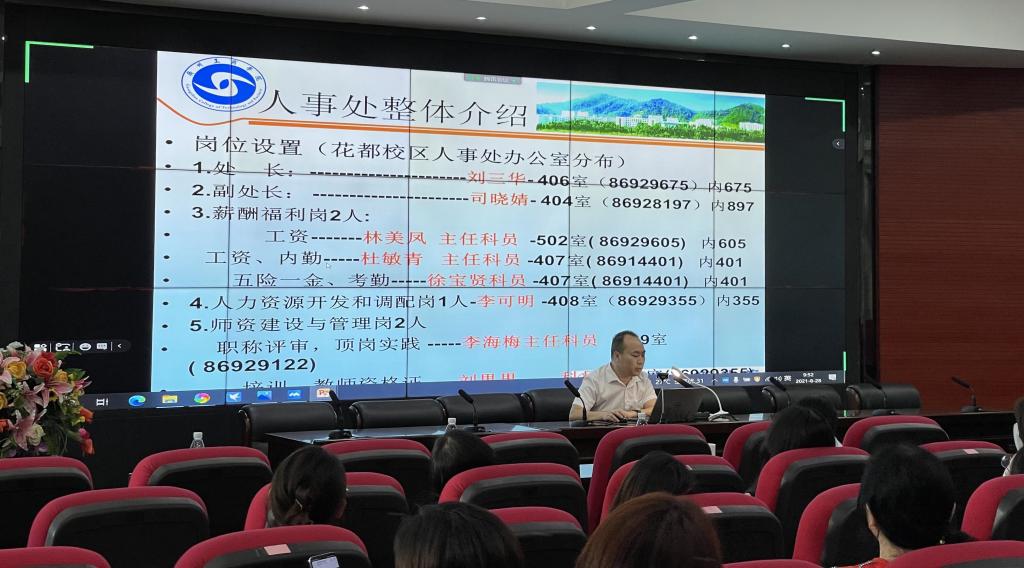 第一个专题,人事处刘三华处长介绍了人事相关政策,细致入微地讲解了学校章程制度、人事制度、职称评审制度等,强调教师要严格遵守学校各项规章制度和师德要求,防止出现教学事故,伴随学校大发展的形势下实现自身的同步发展。