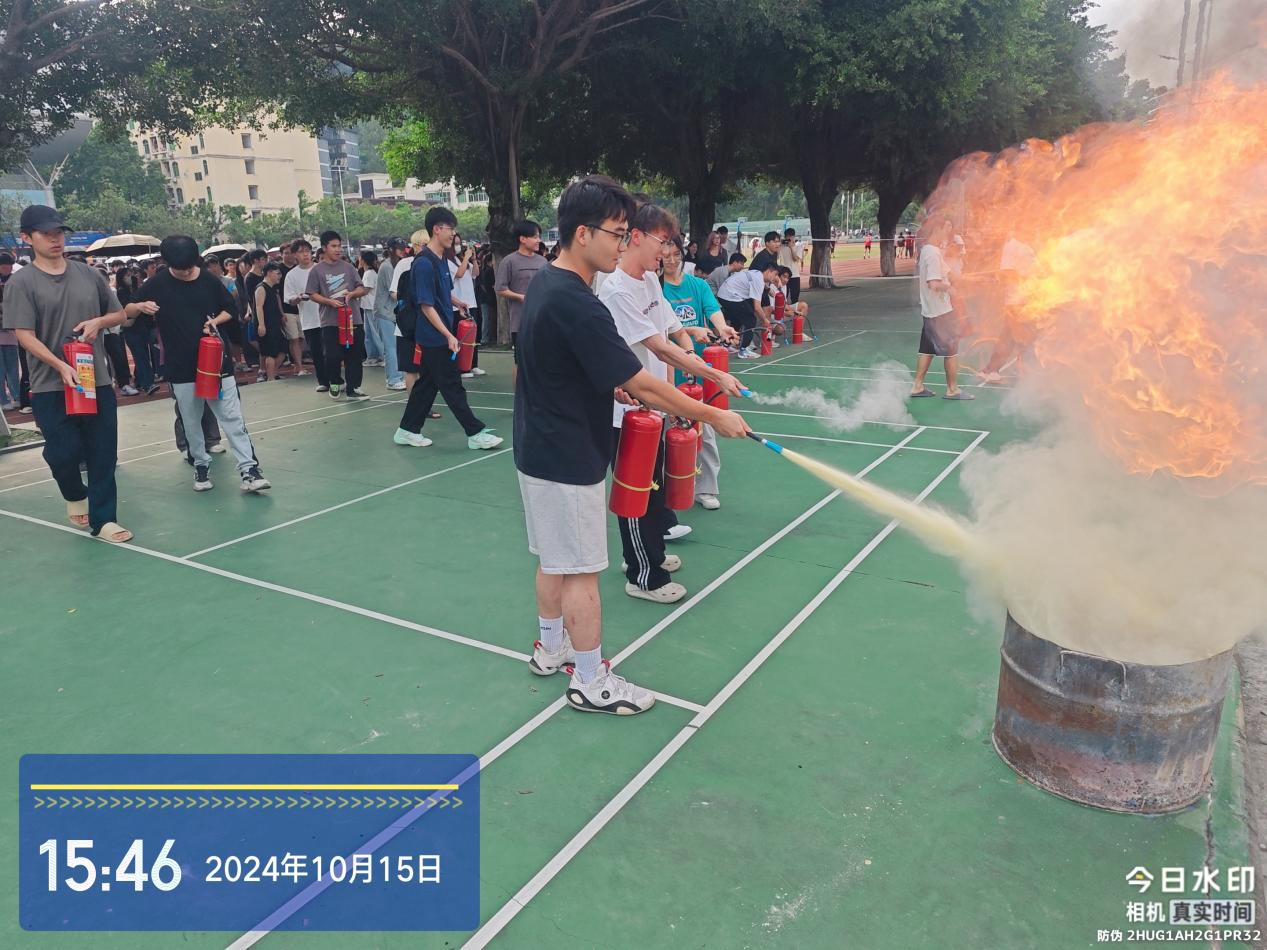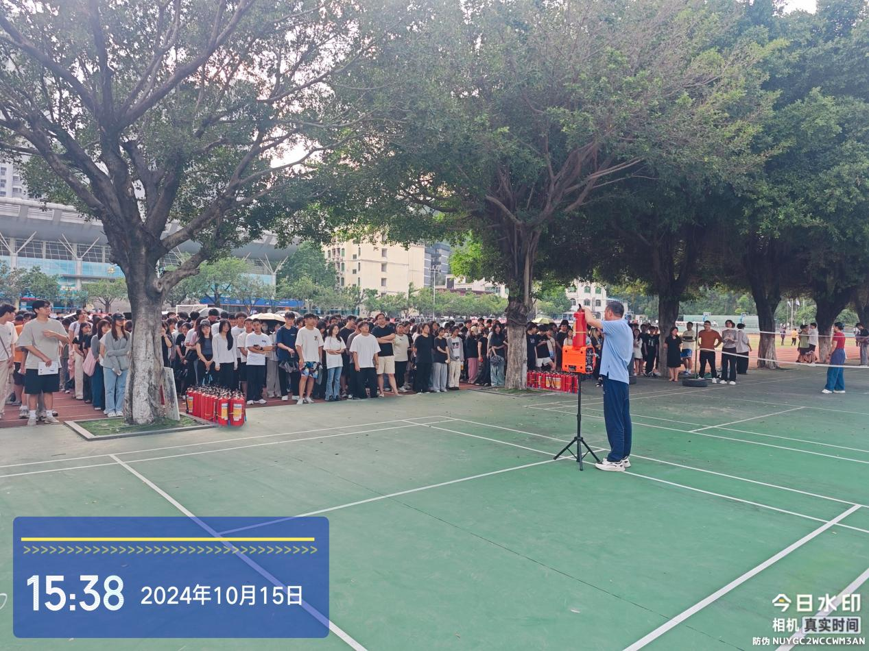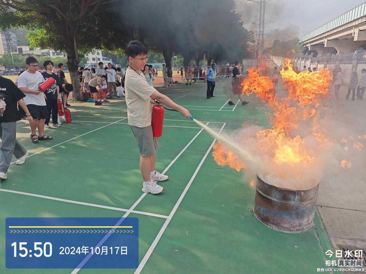 在实践操作环节,学校保卫处赵德明队长向同学们讲解了灭火器的正确使用方法,并现场指导学生规范使用灭火器灭火。通过现场观摩,学生们更加深入地了解了消防器材的使用方法和注意事项,提升了使用消防器材的技能。