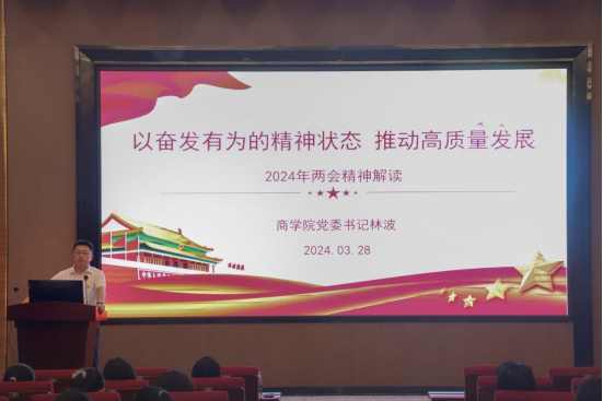 为深入贯彻落实党的二十大精神,推动习近平新时代中国特色社会主义思想进校园、进课堂、进头脑。3月28日晚上,商学院2024年春季学期“书记院长思政第一课”在图书馆416报告厅开讲。商学院党委书记林波教授以“以奋发有为的精神状态,推动高质量发展”以及“逐浪潮头再击桨,无边胜景在前方”两个主题,为在场师生带来一堂生动而深刻的思政课。