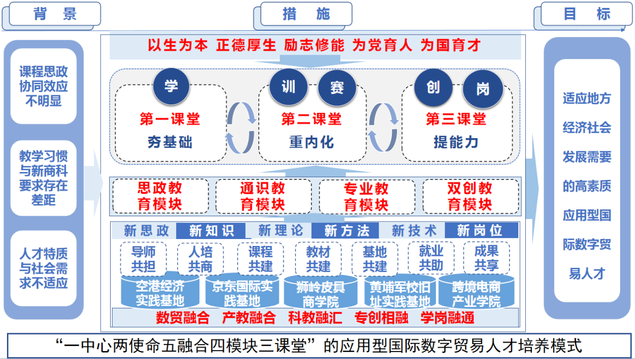 以学生为中心,践行“为党育人,为国育才”两项使命,在“学、训、赛、创、岗”课堂互动中,深化数贸融合、产教融合、科教融汇、专创融合、学岗融通,实施思政、专业、通识、创新创业四模块教育,形成“一中心两使命三课堂五融合四模块”的应用型国际数字贸易人才培养模式。