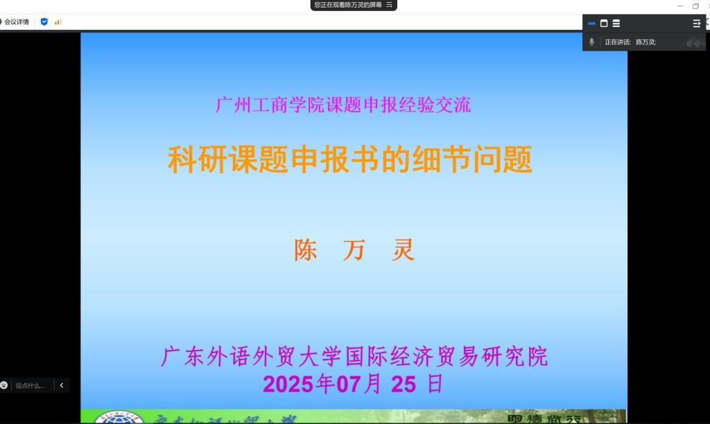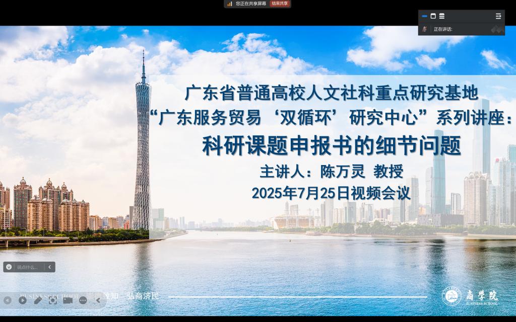 为进一步学院教师高层次项目申报能力与水平,促进学院学科发展,推动硕士培育点建设,商学院于2025年7月25日下午3点举办主题为《科研课题申报书的细节问题》的线上学术讲座。讲座特邀国家社科基金评审专家陈万灵教授担任主讲,共吸引了超过40名教师参加。讲座由商学院关建波副院长主持。