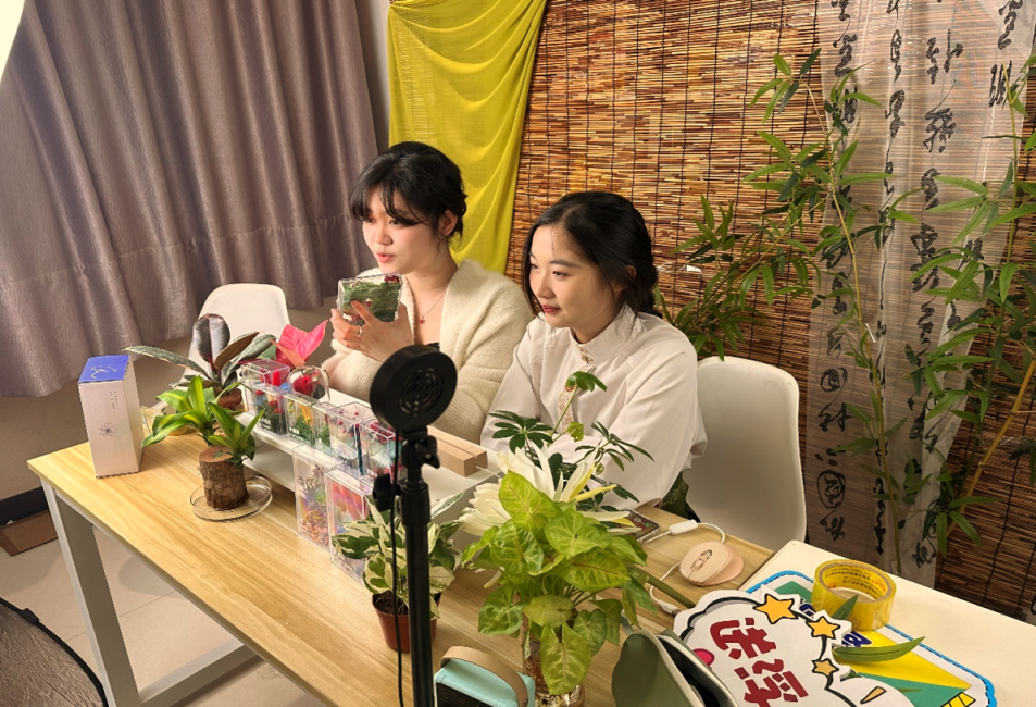 随后,他们在商学院直播基地以国风为主题搭建了助农直播间,并购买了绿竹、书法帘、细竹帘等道具装饰,搭配了与直播间风格相呼应的服装,从这些方面为他们的产品继续赋能。实际上,早在选品之前,小猪队团队内部就拟好了与企业理念对接的直播策划书,其中一位选品负责人表示,品类到手后,便立刻根据产品特性撰写好了相关的直播话术提示词,为后续的直播内容不断积累着坚实的基础。
