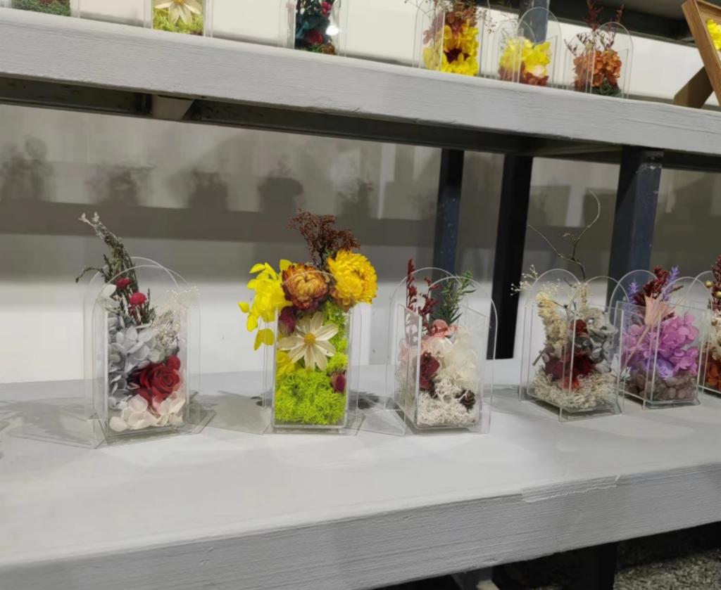 跨境电子商务协会的成员与电商专业的同学一起组建了“猪猪侠说的都队”(以下简称“小猪队”)小队,队员包括跨境电商专业的包芮、蓝启慧、谭昀妮和黄一航,以及电商专业的邱天养和林福佳。该团队对接的企业是广州花都溪林园艺有限公司,这是一家以行业创新与资源整合为驱动的综合型绿植产业平台。11月27日小猪队前往了溪林园艺企业基地进行产品的挑选,并最终确定了如下款式:永生花植物盒子系列(部分)和一些绿植盆栽。