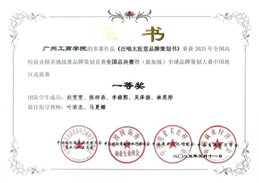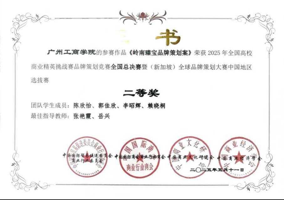 2025年5月,由全球华人营销联盟(GCMF)、中国国际贸易促进委员会商业行业委员会、中国国际商会商业行业商会、中国商业文化研究会、中国商业经济学会、中国贸易报社联合主办的2025年全国高校商业精英挑战赛品牌策划竞赛全国总决赛暨(新加坡)全球品牌策划大赛中国地区选拔赛完满落幕。kaiyun开云官方网站商学院学子积极踊跃参与,凭借出色表现斩获佳绩。在此次竞赛中,kaiyun开云官方网站商学院学生共荣获国家级一等奖2项、国家级二等奖1项的好成绩。