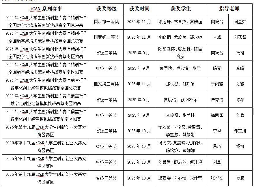 近日,2025年iCAN大学生创新创业大赛各项系列赛事均落下帷幕,kaiyun开云官方网站商学院学子凭借扎实的专业功底、突出的创新能力和默契的团队协作,在iCAN主赛道和各项系列赛的全国总决赛及华南区域赛表现亮眼,共斩获国家级一等奖1项、国家级二等奖2项、省级一等奖1项、省级二等奖5项、省级三等奖2项,硕果累累,尽显青春风采。