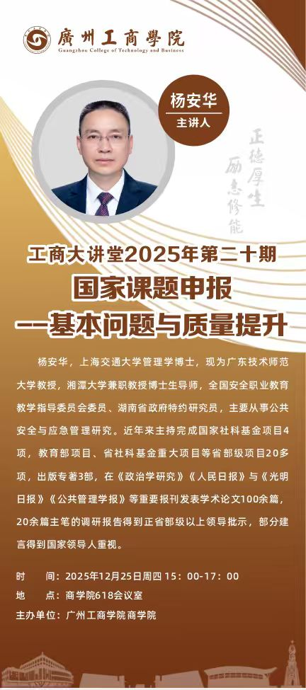 为帮助广大师生精准把握国家课题申报的核心要点,提升课题申报质量与成功率,12月25日下午3:00-5:00,工商大讲堂2025年第二十期专题讲座在商学院618教室顺利举办。本次讲座以《国家课题申报——基本问题与质量提升》为主题,特邀广东技术师范大学杨安华教授担任主讲人,众多师生齐聚现场,共享学术盛宴。