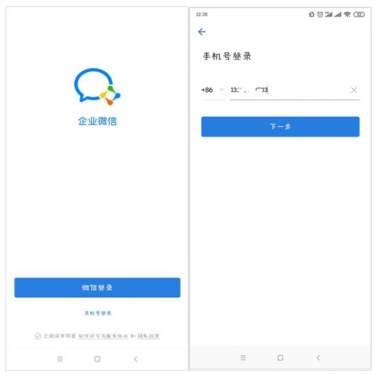 (1)打开企业微信,选择【手机号登录】,输入手机号码,点击【下一步】