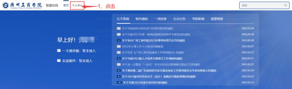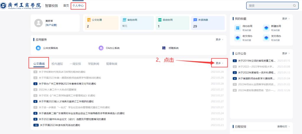 电脑登录融合服务门户,点击-“个人中心”,找到公文查阅模块,点击-“更多”进入公文查阅页面,如图所示: