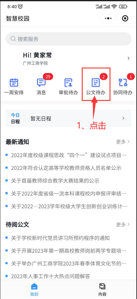 从企业微信-“工作台”进入融合服务门户,找到待阅公文模块,点击-“更多”进入公文查阅页面,如图所示: