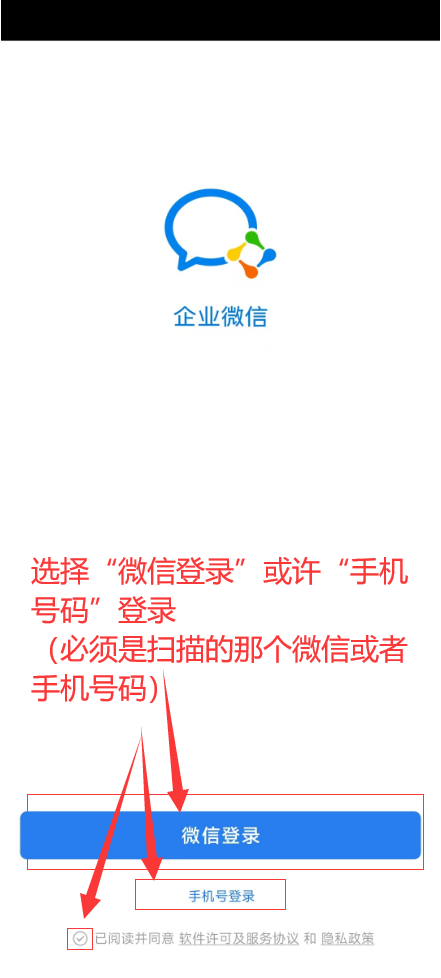 第二步:打开企业微信,用扫码的微信或者手机号码登录企业微信