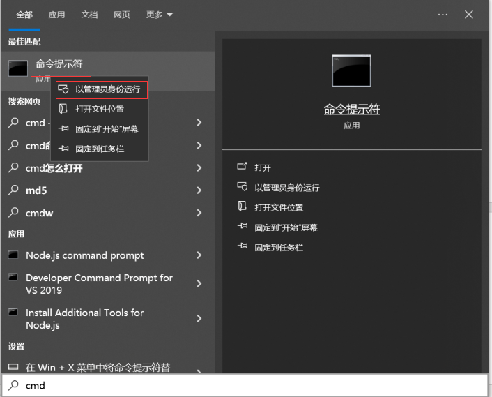 2)在搜索框输入cmd,选择“命令提示符”,单击右键,并以管理员身份运行(图1-2)。