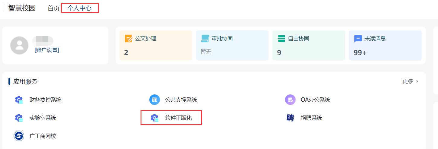 1) 登录方式:访问https://usc.gzgs.edu.cn,进入学校融合服务门户(图2-1)->点击“个人中心”->点击“软件正版化”链接(图2-2),跳转至“正版软件管理与服务平台”。