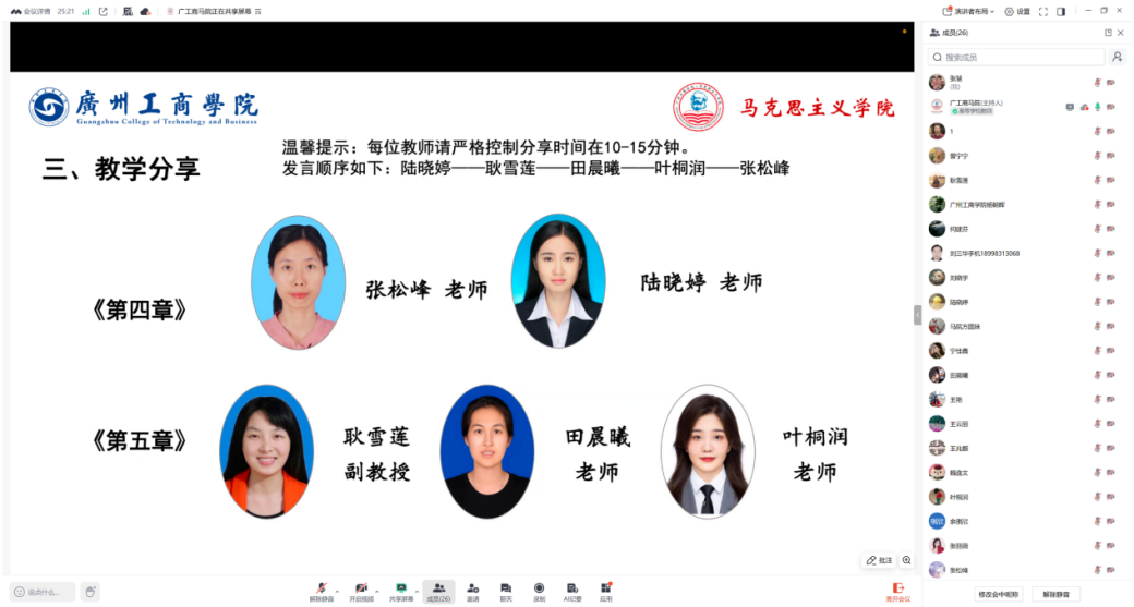 为深入推进学校“德学·五进”教育理念,促进教学交流,提升教师教学能力,2025年11月13日晚思想道德与法治课程教研室在线上召开集体备课会,会议由教研室主任彭艺格老师主持,本学期教授德法课程的全体老师参会。会议分为四部分内容。
