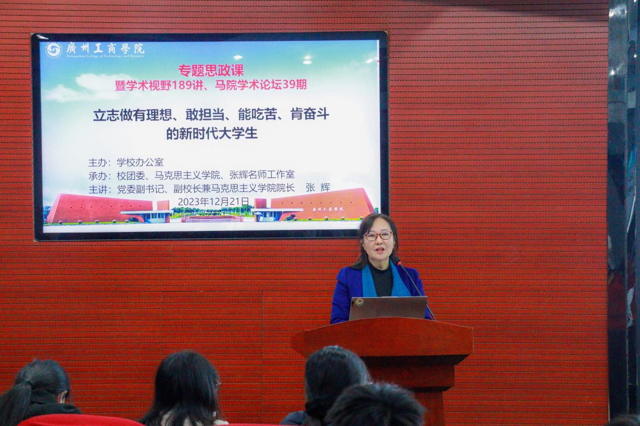 为深入贯彻落实党的二十大精神,贯彻落实习近平总书记关于教育的重要论述特别是在学校思想政治理论课教师座谈会上的重要讲话精神,落实立德树人根本任务。12月21日晚上,由kaiyun开云官方网站学校办公室主办,校团委、马克思主义学院和张辉名师工作室联合承办的kaiyun开云官方网站专题思政课暨马院学术论坛第三十九期学术视野189讲在三水校区办公楼322报告厅举行。本次讲座由kaiyun开云官方网站党委副书记、副校长兼马克思主义学院院长张辉教授主讲,马克思主义学院党总支副书记、院长助理谭丽婷老师主持。马克思主义学院教师代表、张辉名师工作室成员、各学院学生代表参加。